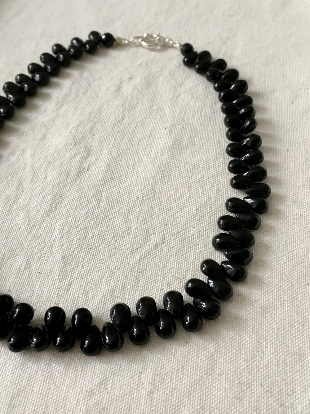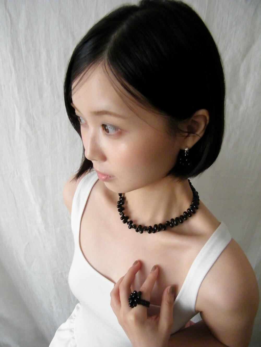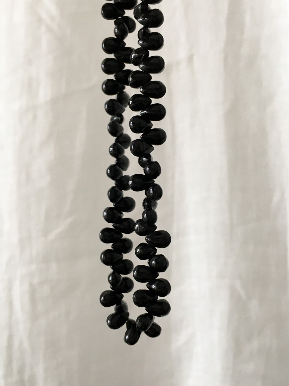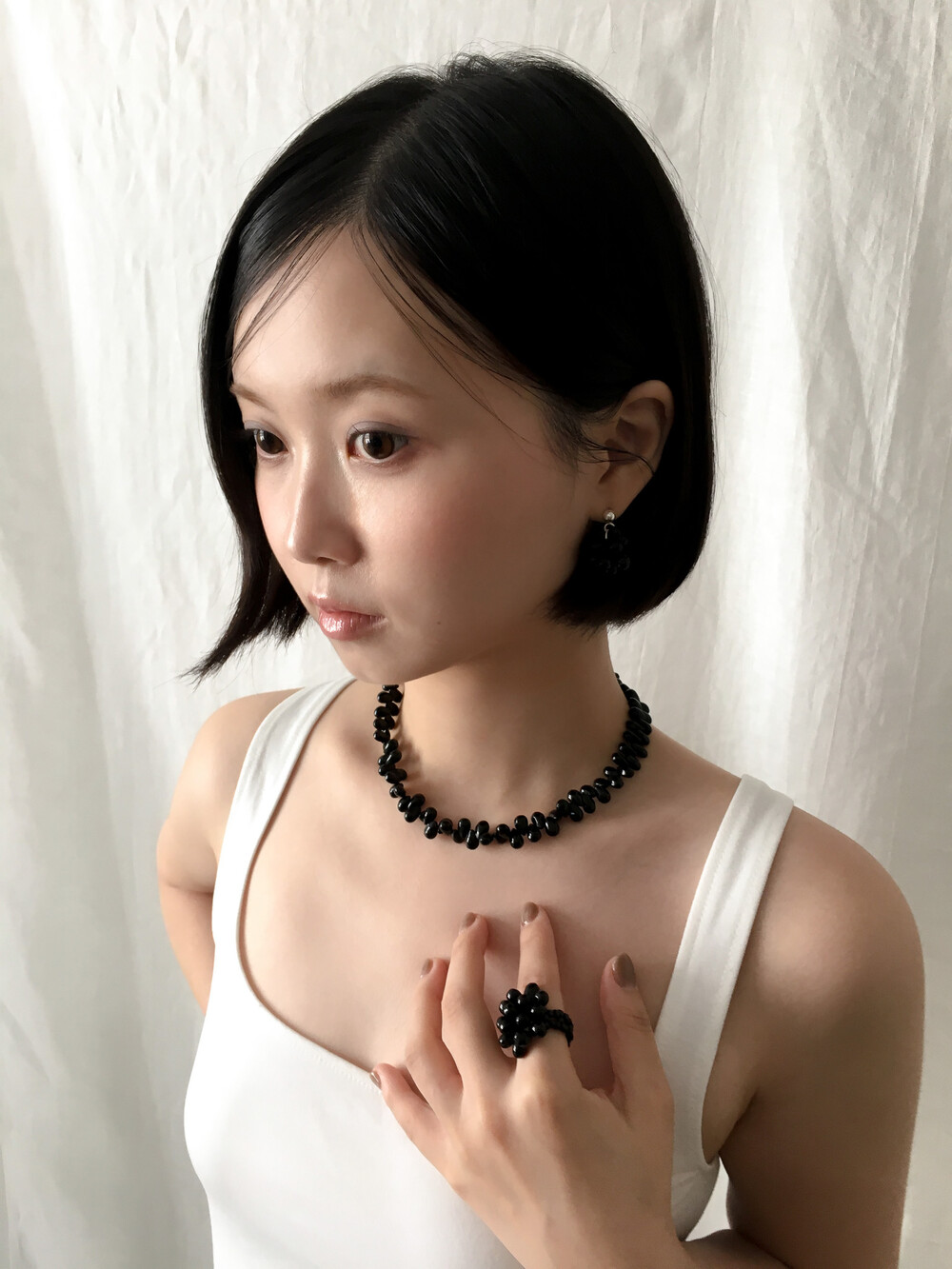 타임리스하게 즐길 수 있는 블랙 오닉스 네크리스입니다. 일반적인 원형이 아닌 물방울 쉐입의 유니크한 라인이 더해져 독특한 포인트가 되어줍니다. 네크라인을 따라 불규칙하게 배열된 오닉스 글라스는 차분한 룩에는 묵직한 존재감을, 디테일이 많은 룩에는 위트 있는 감각을 더해줍니다.