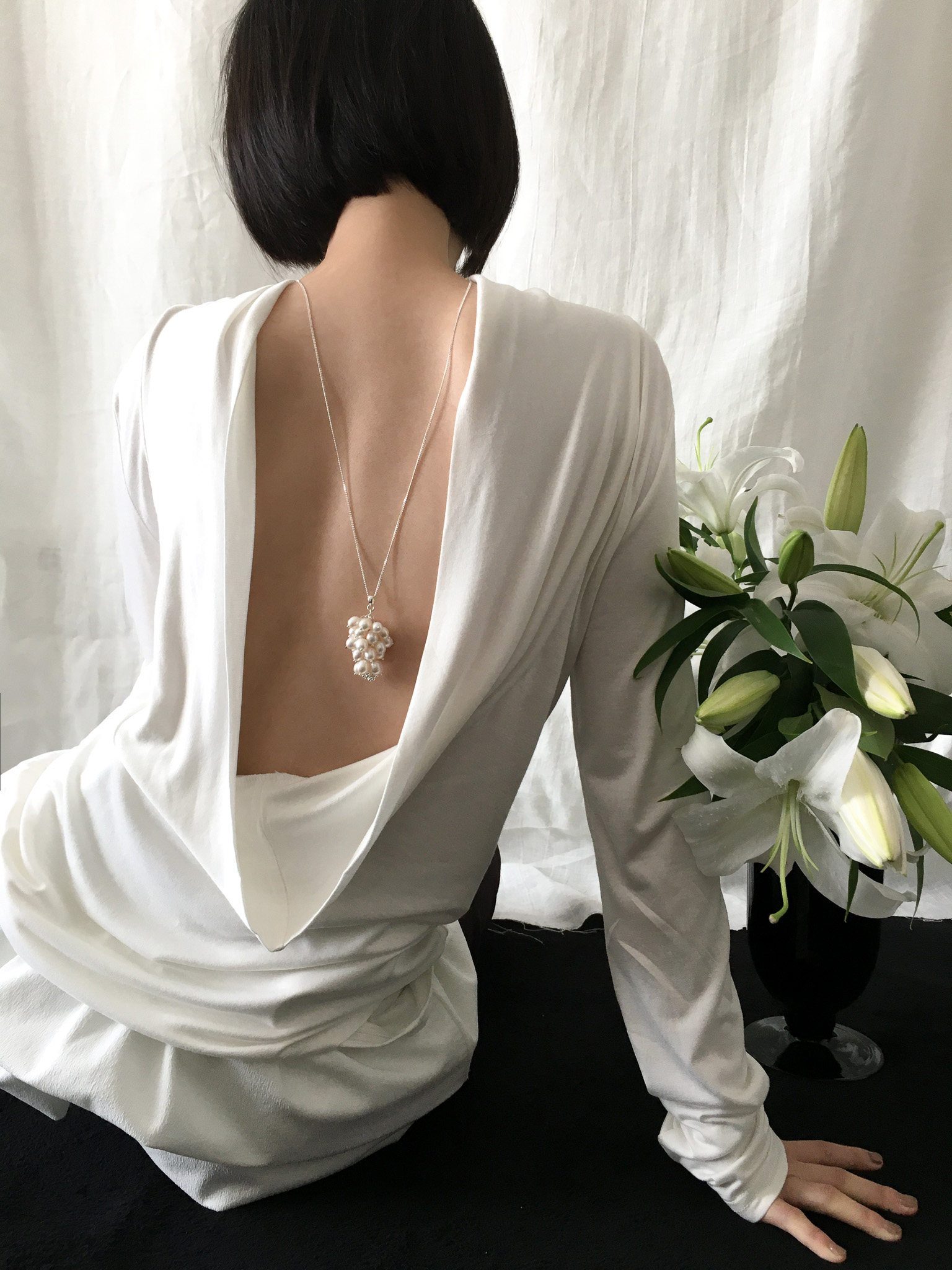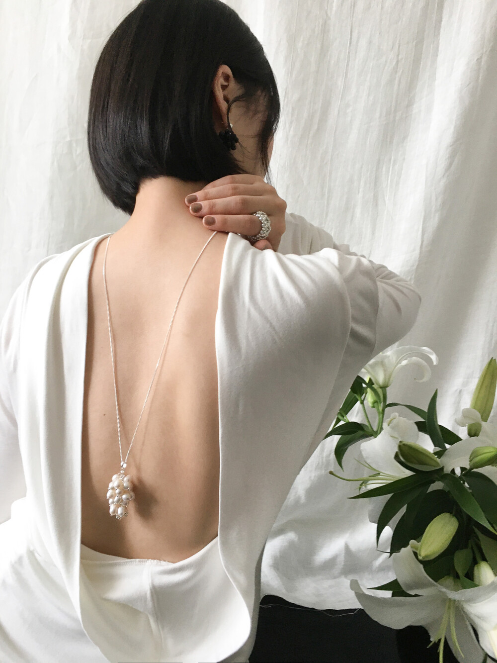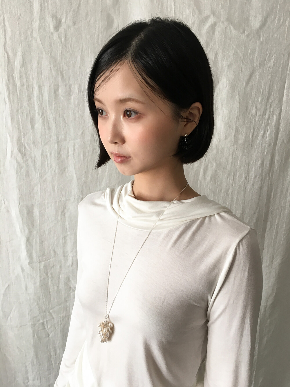 소프트한 아이보리 담수 진주를 하나하나 정성스럽게 더했습니다. 이전 버전보다 볼드한 실루엣을 표현하기 위해, 보다 풍성하게 담수 진주를 배치하여 디벨롭했습니다.