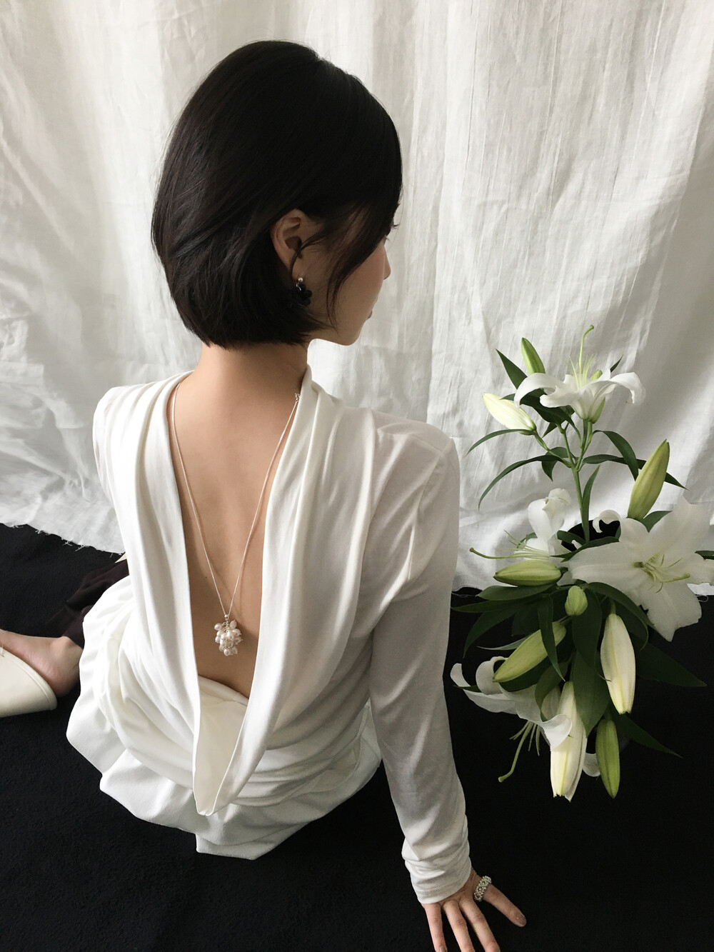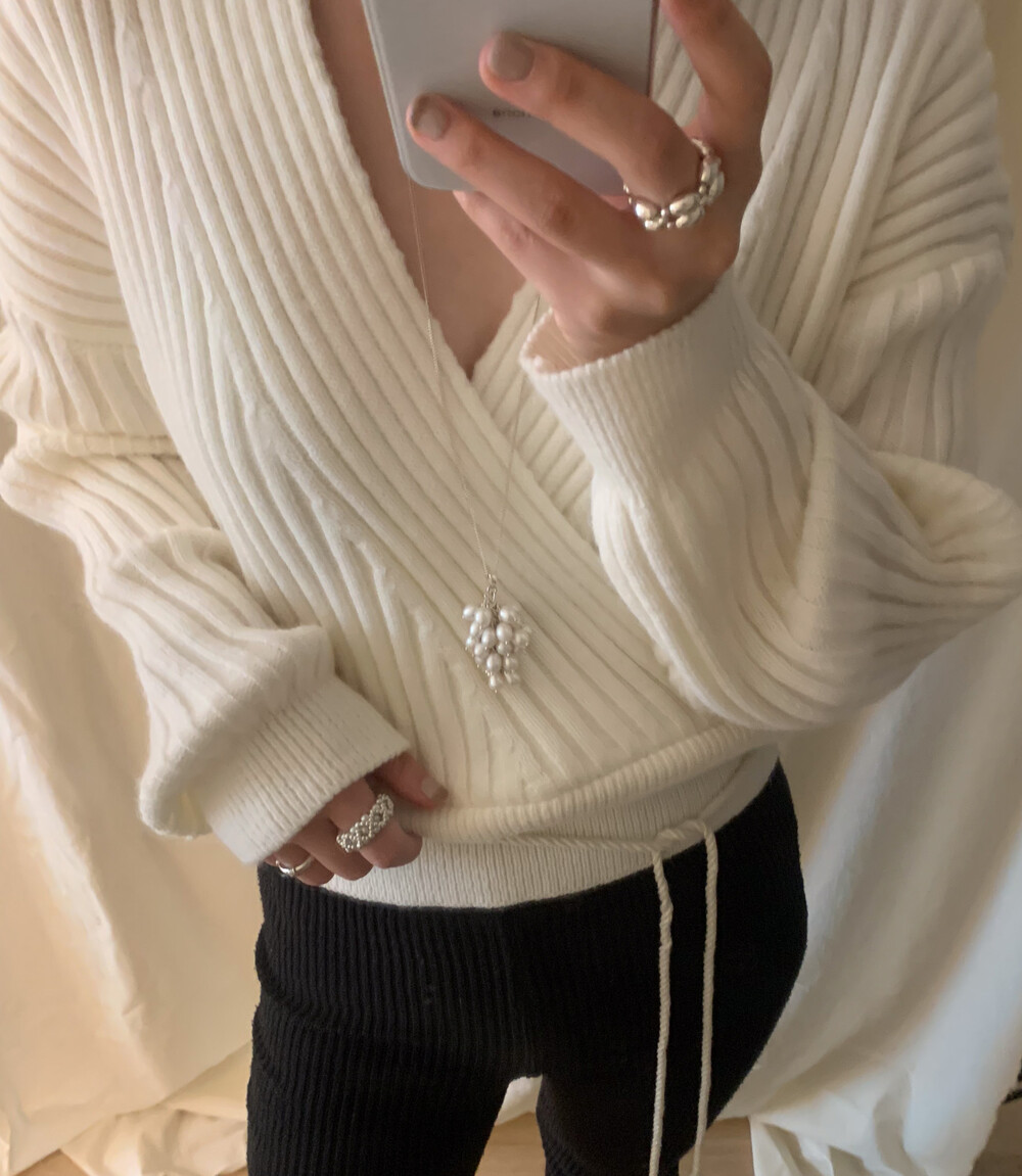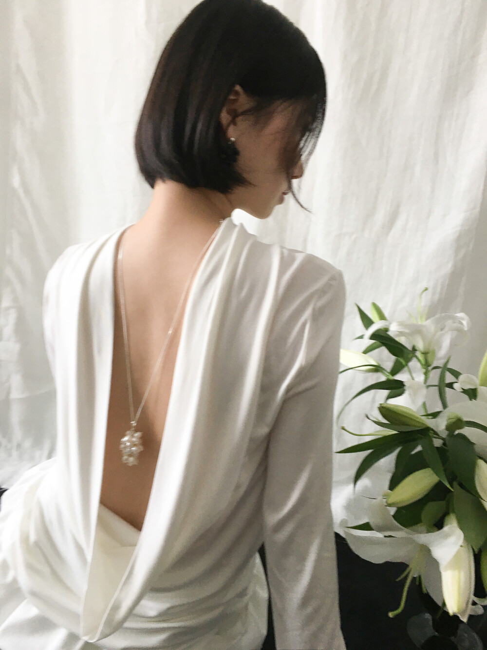 소프트한 아이보리 담수 진주를 하나하나 정성스럽게 더했습니다. 이전 버전보다 볼드한 실루엣을 표현하기 위해, 보다 풍성하게 담수 진주를 배치하여 디벨롭했습니다.