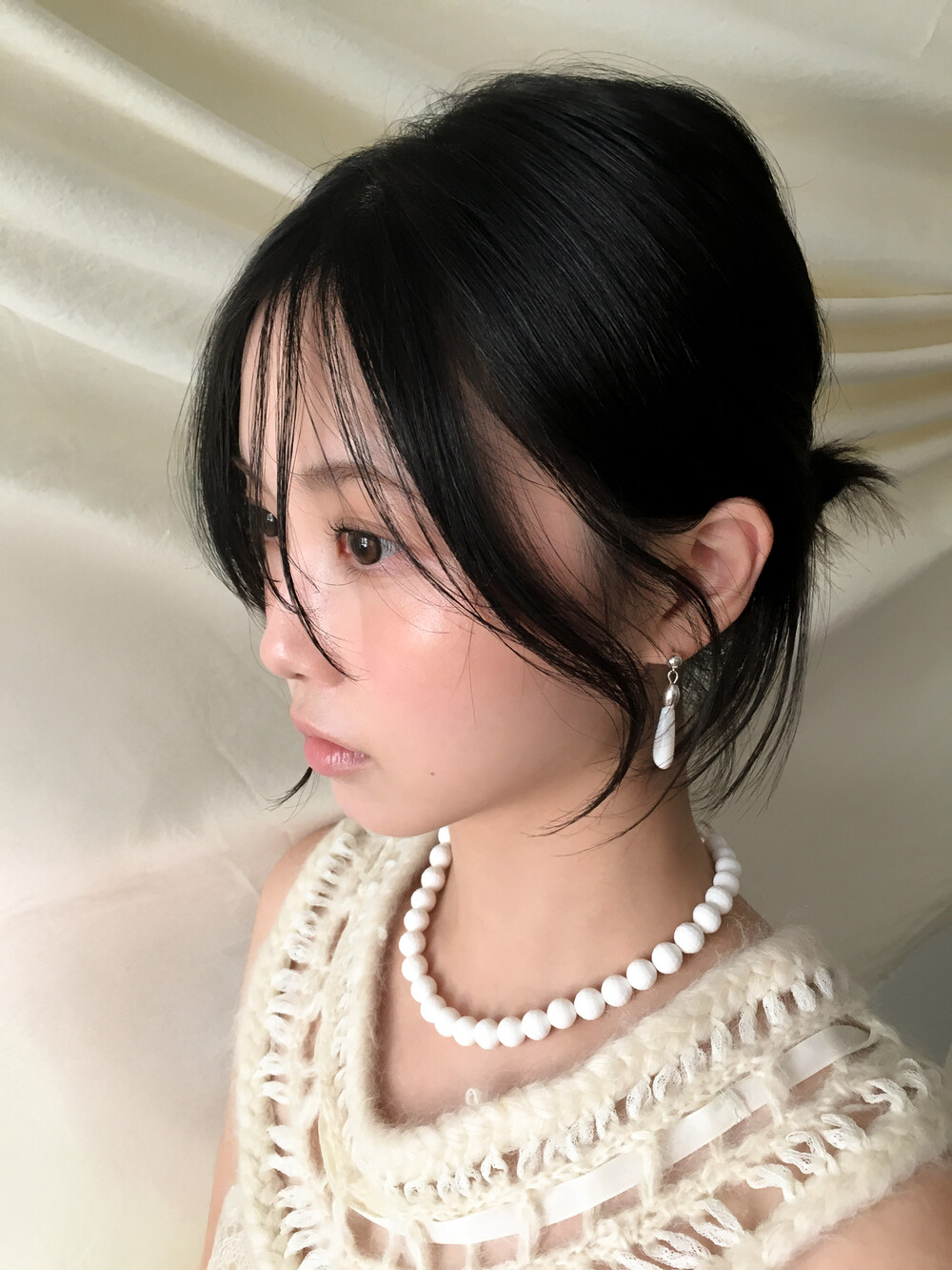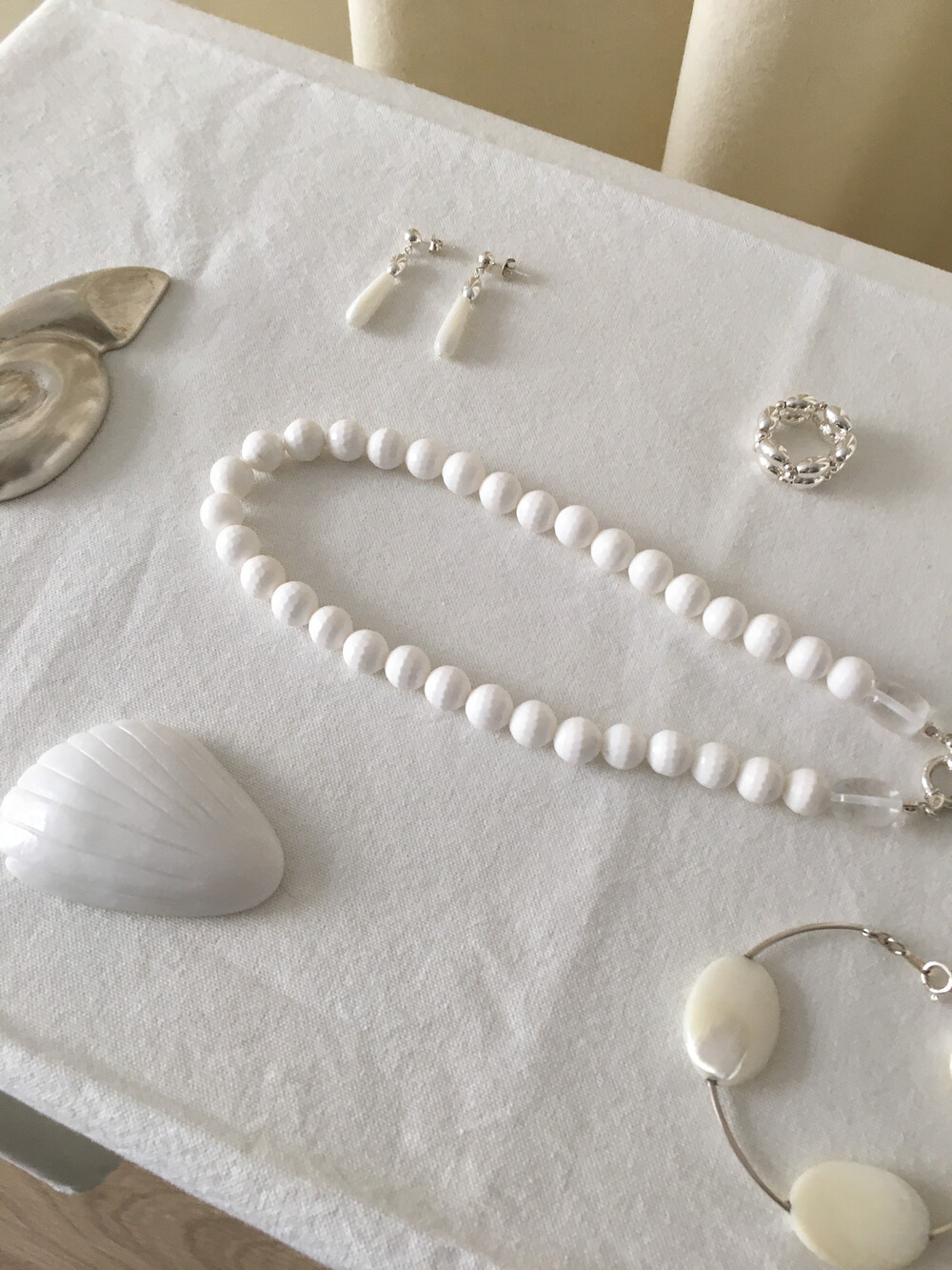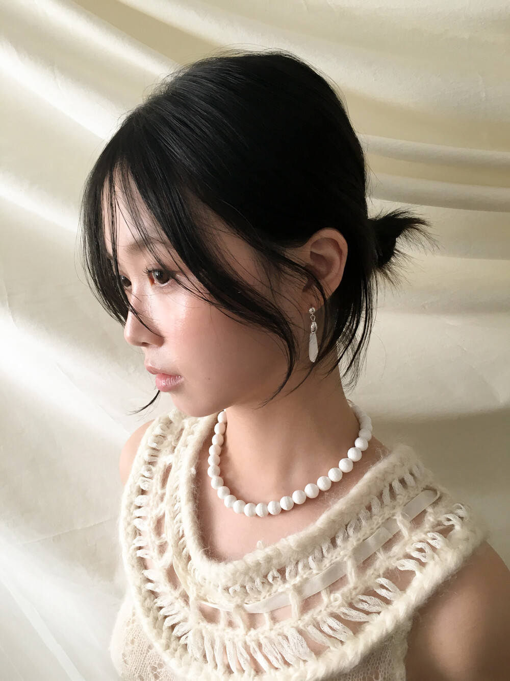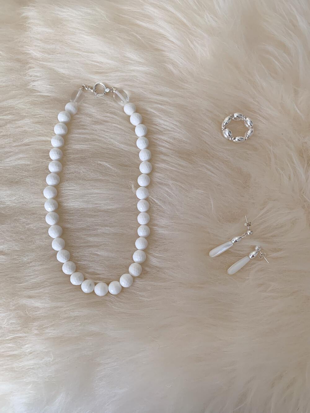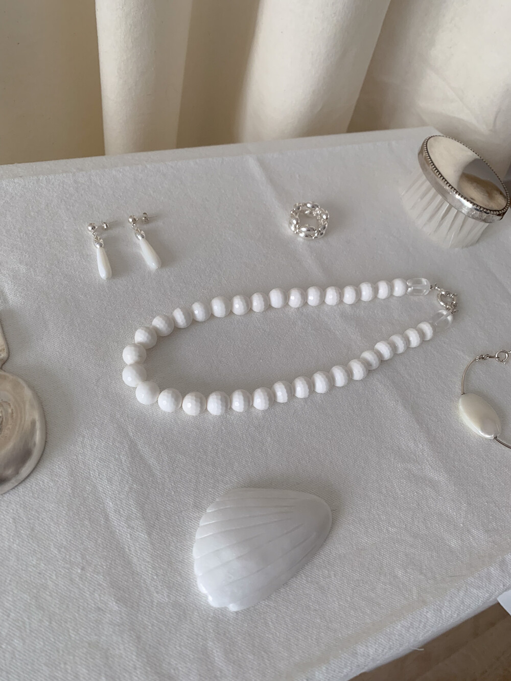 순백의 자개로 단정한 실루엣을 완성시키는 페일 네크리스입니다.
