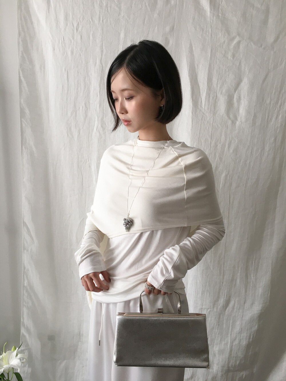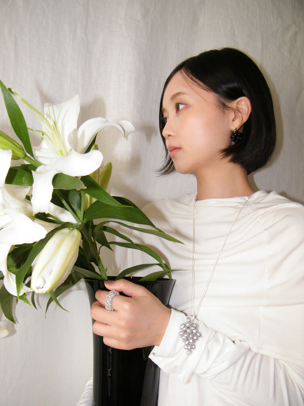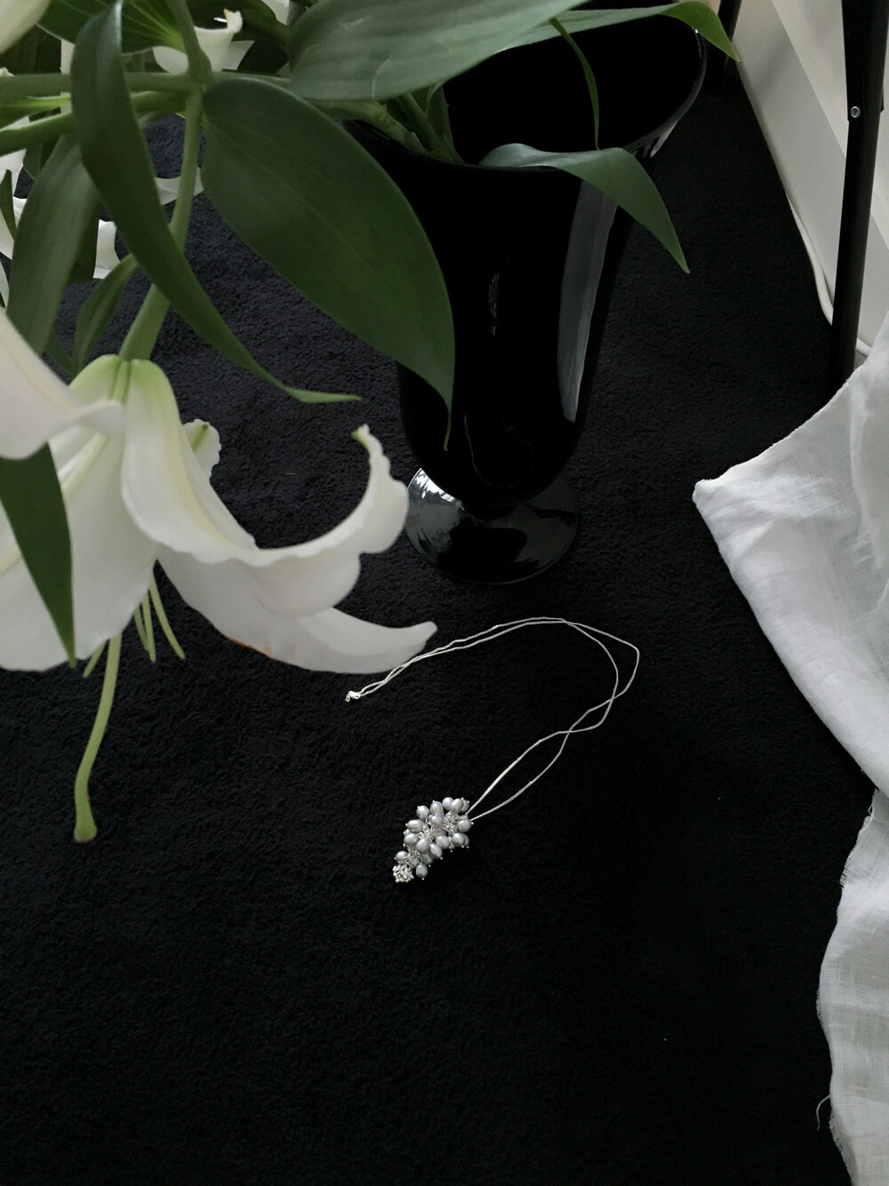 빈티지한 실버 담수 진주를 하나하나 정성스럽게 더했습니다. 이전 버전보다 볼드한 실루엣을 표현하기 위해, 보다 풍성하게 담수 진주를 배치하여 디벨롭했습니다.
