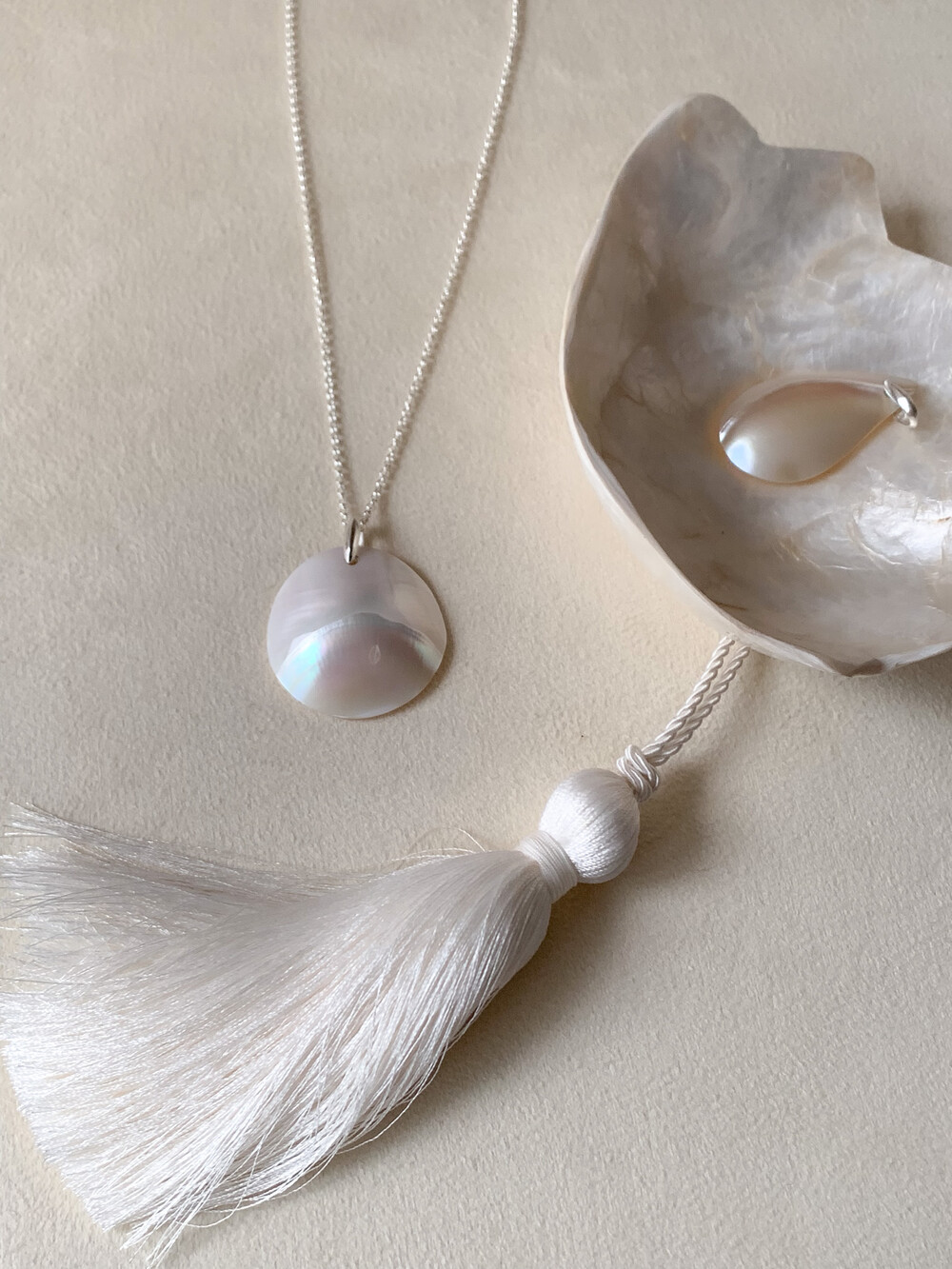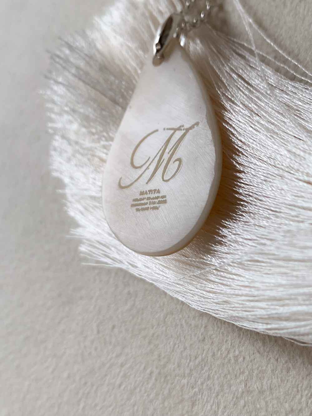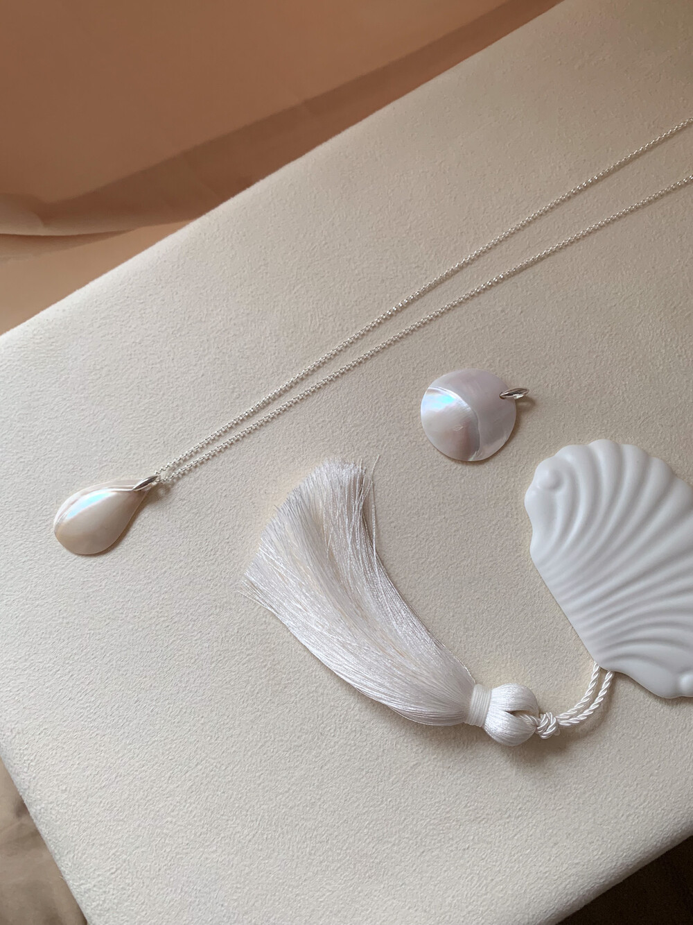 새틴 쉘의 부드럽고 아름다운 나강 자개 펜던트의 롱 네크리스입니다. 실크처럼 은은한 광이 감도는 네크리스로, 담백하고 차분하답니다. 각기 비슷한 듯 다른 쉐입을 가진 자개로 본래 펜던트용이 아니나, 작업자의 섬세한 손길로 하나하나 목걸이용 펜던트로 제작됩니다. Sterling Silver의 두께감 있는 고방 체인으로 반짝이는 실버 광택감이 고급지답니다. 물방울 형태와 둥근 원형의 두 가지 타입으로 선택하실 수 있습니다. 자개 뒷면에는 마티타의 로고가 섬세하게 각인되어 있습니다. 단 하나의 스타일링 만으로도 전체적인 룩의 분위기가 더욱 우아하게 표현됩니다. 순간순간 즐겁게 손길이 닿는 네크리스로 경험해 보세요.