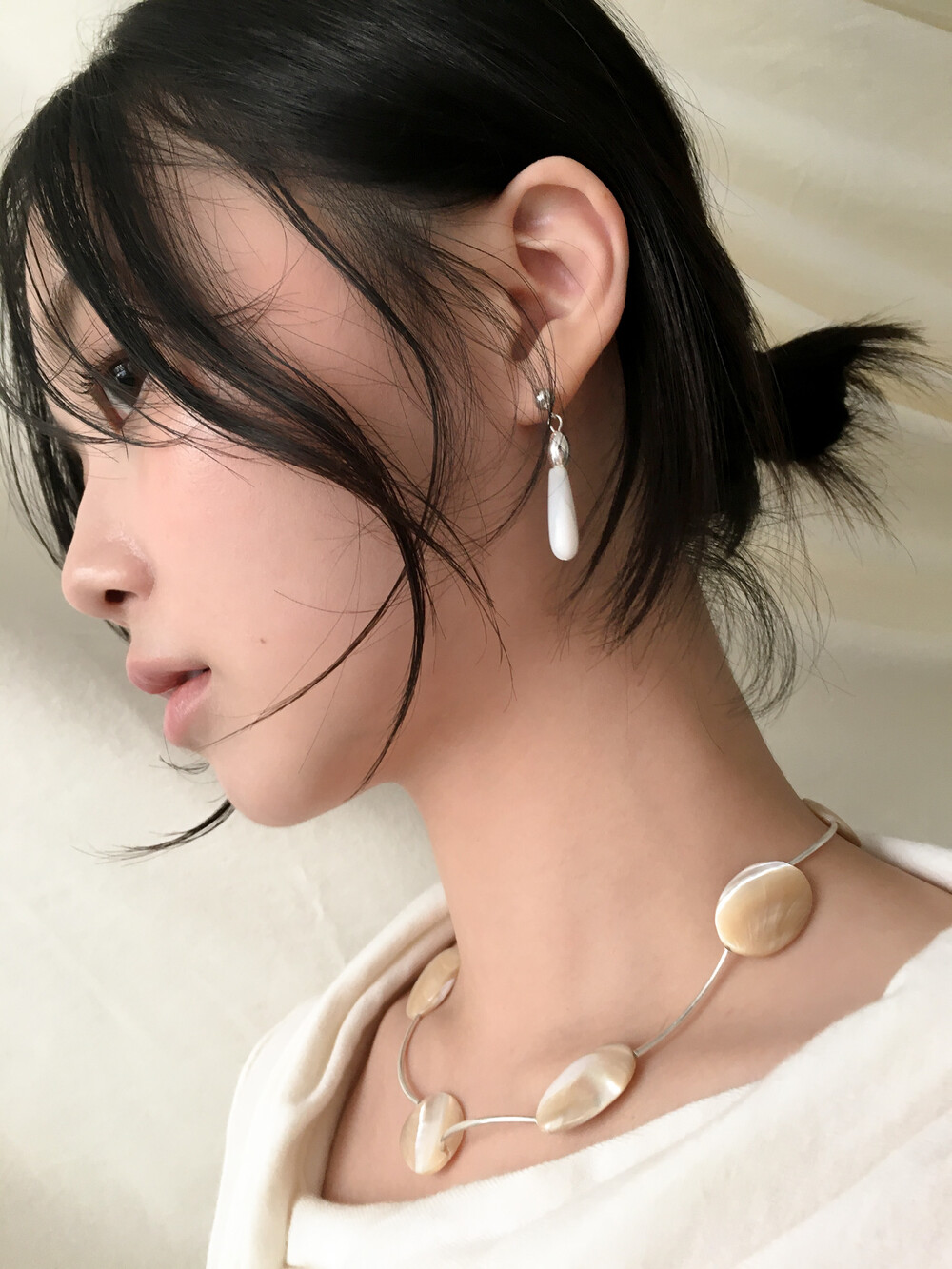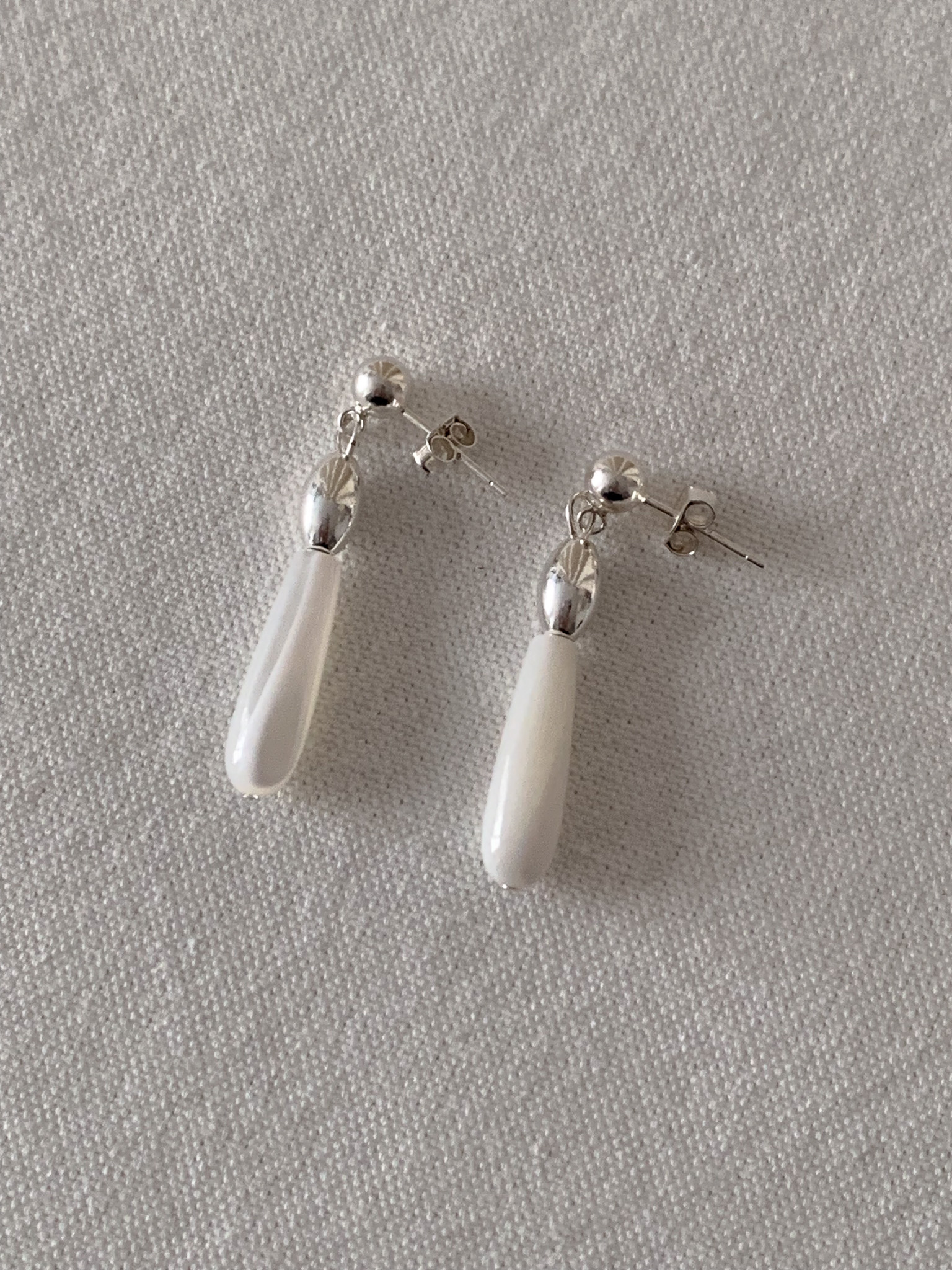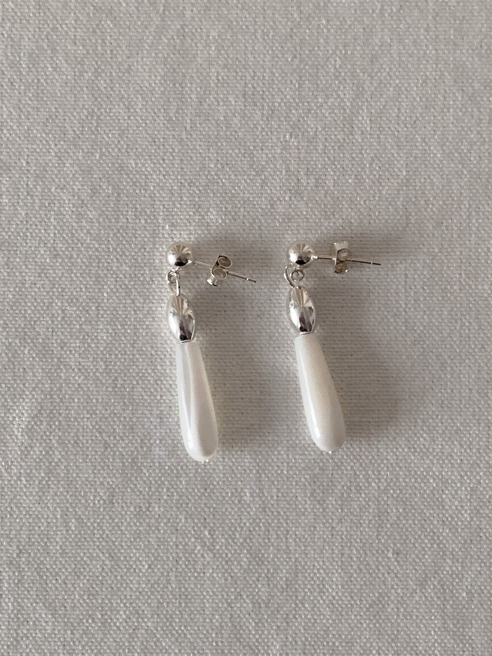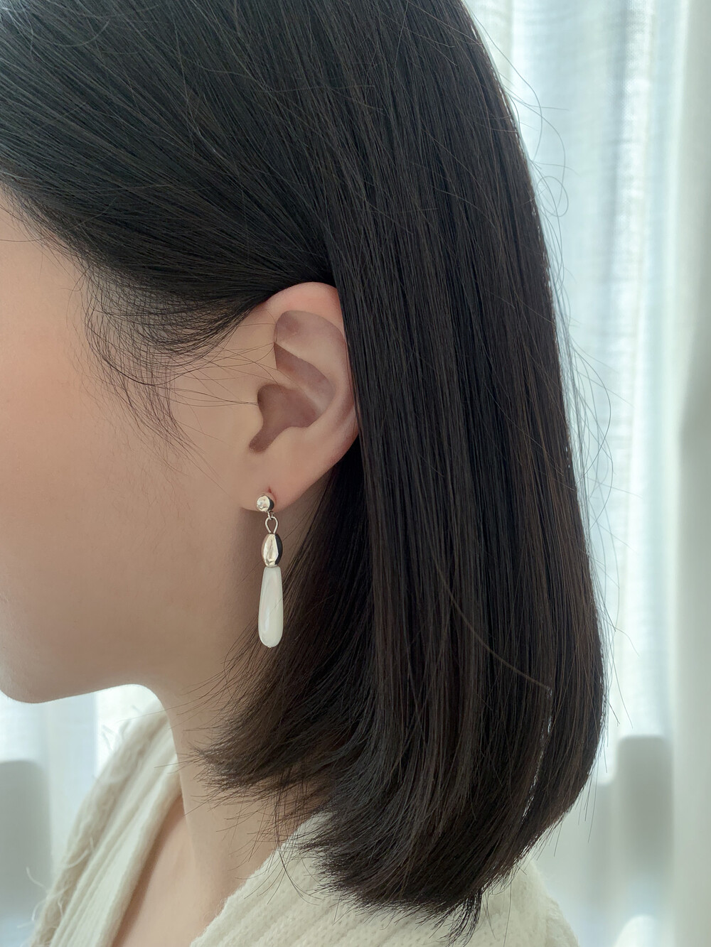 화이티한 색감과 매우 우아한 드롭 형태의 실루엣으로, 너무나 매력적인 자개 이어링입니다.