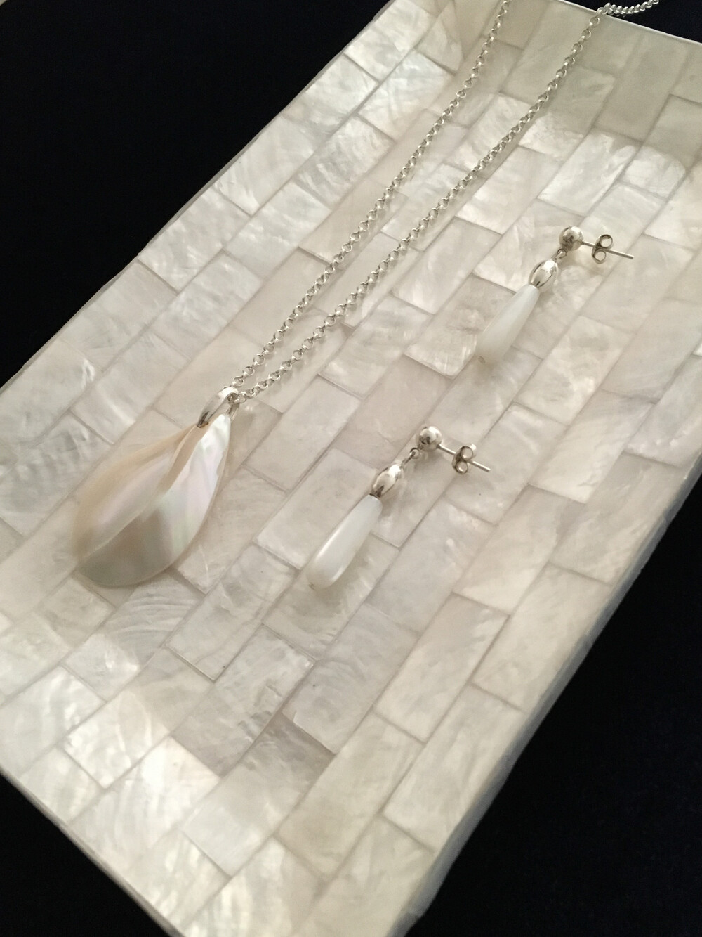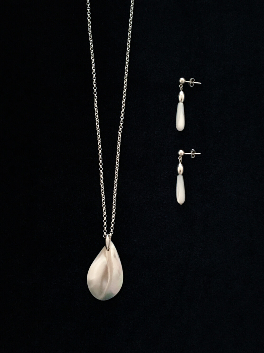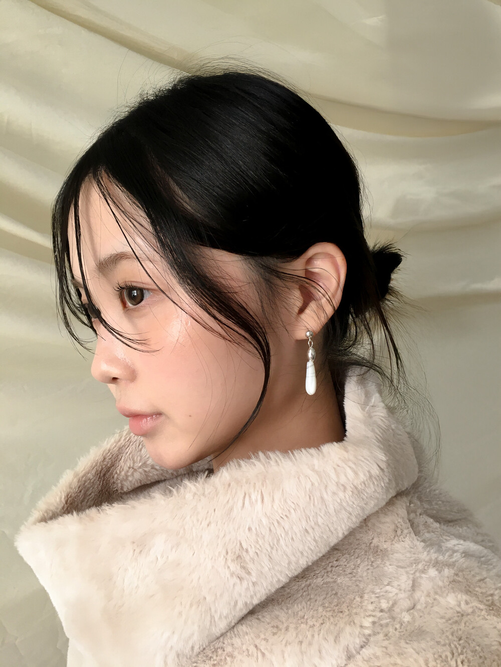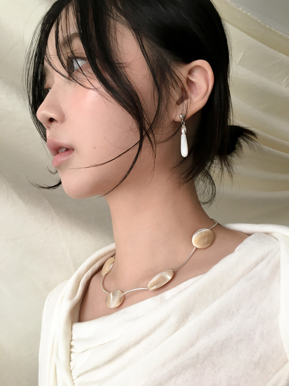화이티한 색감과 매우 우아한 드롭 형태의 실루엣으로, 너무나 매력적인 자개 이어링입니다.